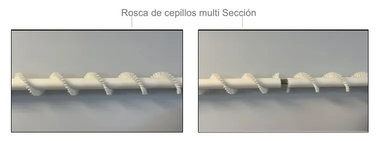 Elimina el polvo adherido al producto mediante un sistema sanitario de roscas y cepillos.